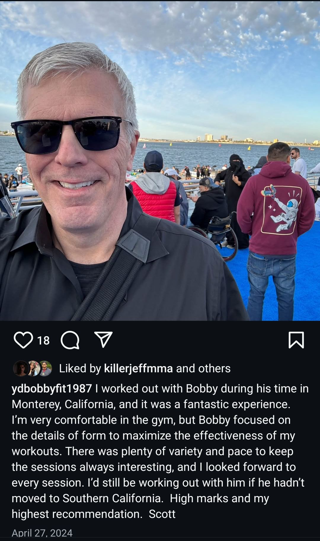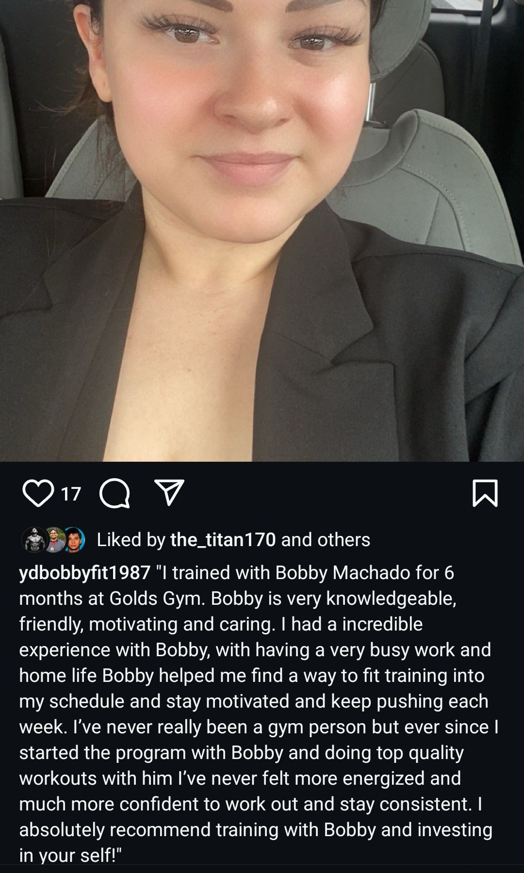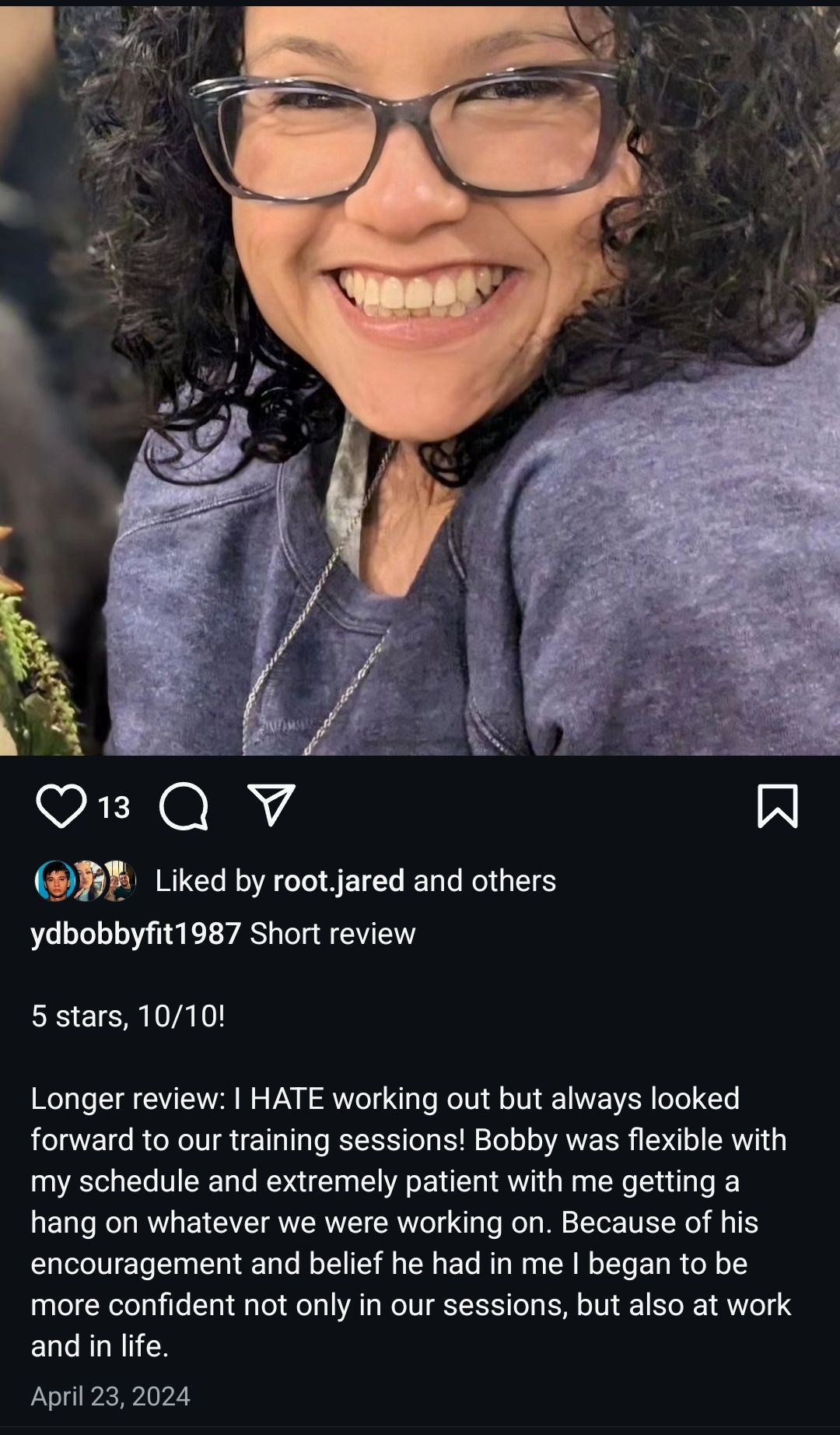 Training with Bobby has helped me become the strongest, healthiest, and most confident version of myself — and I’ll always be grateful for his guidance.